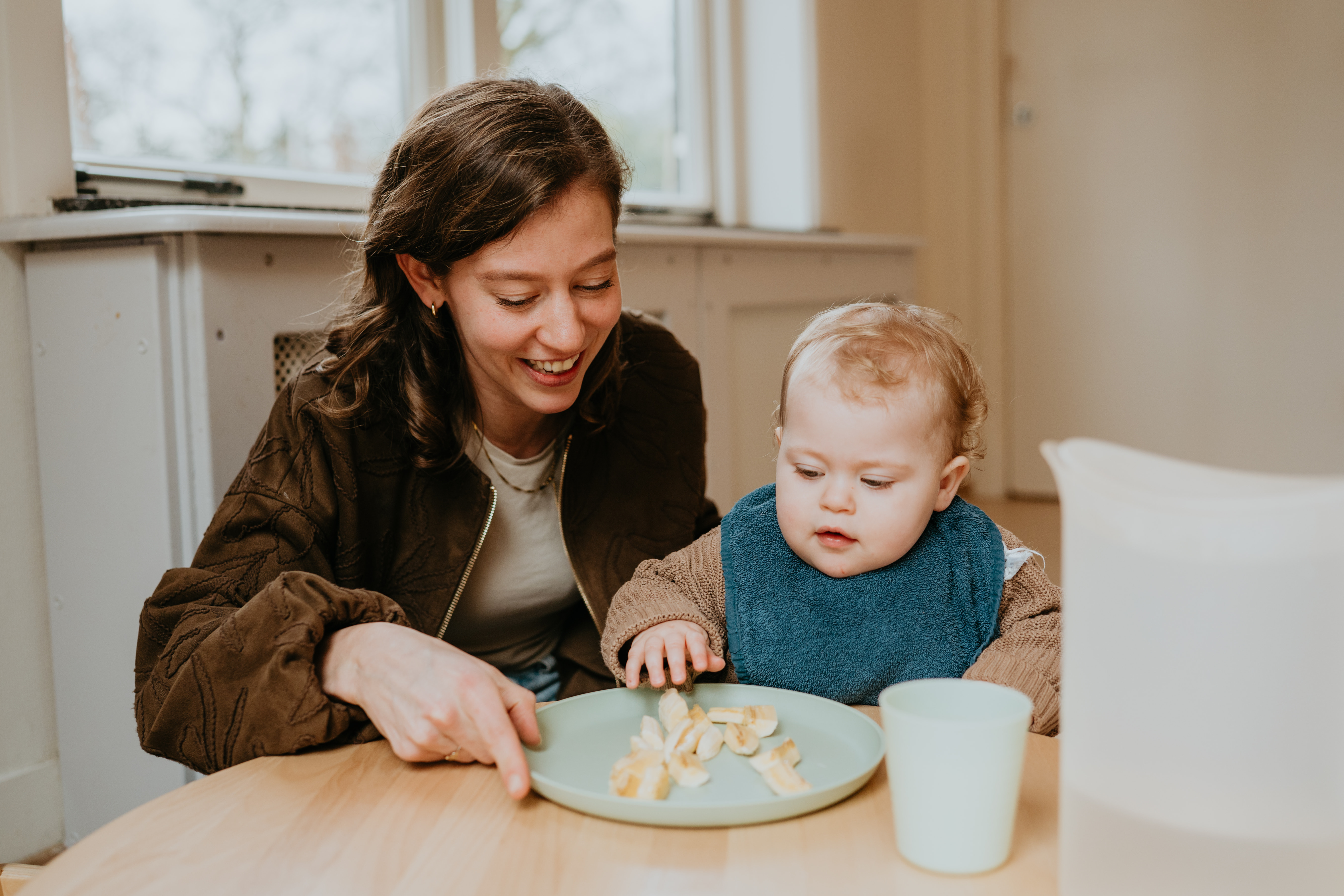 Baby’s die meegaan in het vaste ritme krijgen fruit. Baby’s die nog niet zelfstandig kunnen zitten, voeden we op schoot. Dat is goed voor hun lichamelijke ontwikkeling én een waardevol 1‑op‑1 moment. Je benoemt wat je doet, zingt een liedje en geeft zo taal en houvast op een natuurlijke manier.