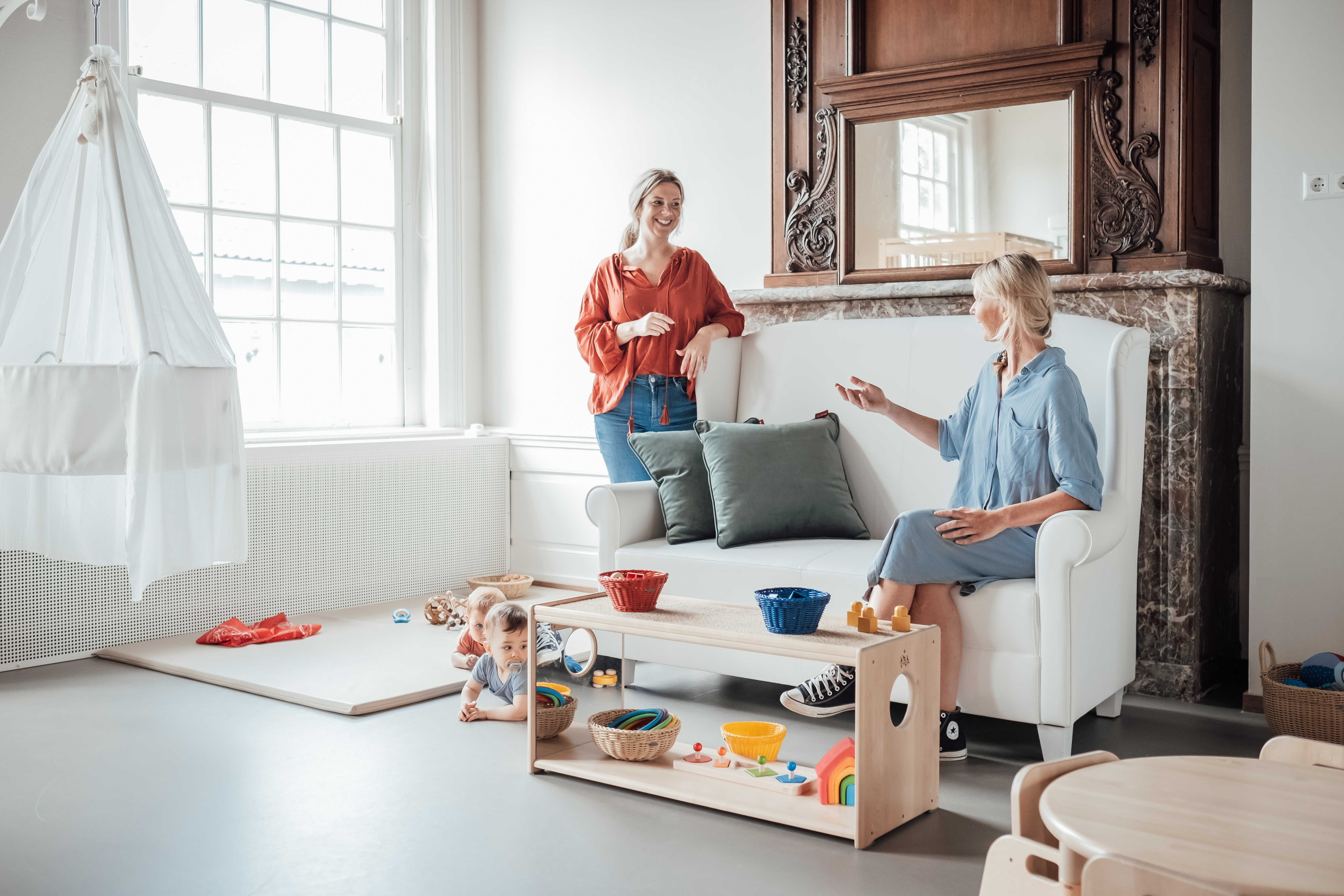 Je start met een warm ontvangst en een overdracht met ouders. Op de babygroep volgen we individuele ritmes want geen kind heeft precies dezelfde dag. De omstandigheden thuis, zoals hoe een kind heeft geslapen, hoe de ochtend is verlopen of wat er verder speelt, hebben allemaal invloed op wat een kind op dat moment nodig heeft. Jij stemt je handelen daarop af en zorgt ondertussen voor een voorspelbare en herkenbare omgeving: vaste plekken, rustige hoeken en materialen op kindhoogte. Zo vinden baby’s sneller hun plek in de groep en komen ze makkelijker tot spel.