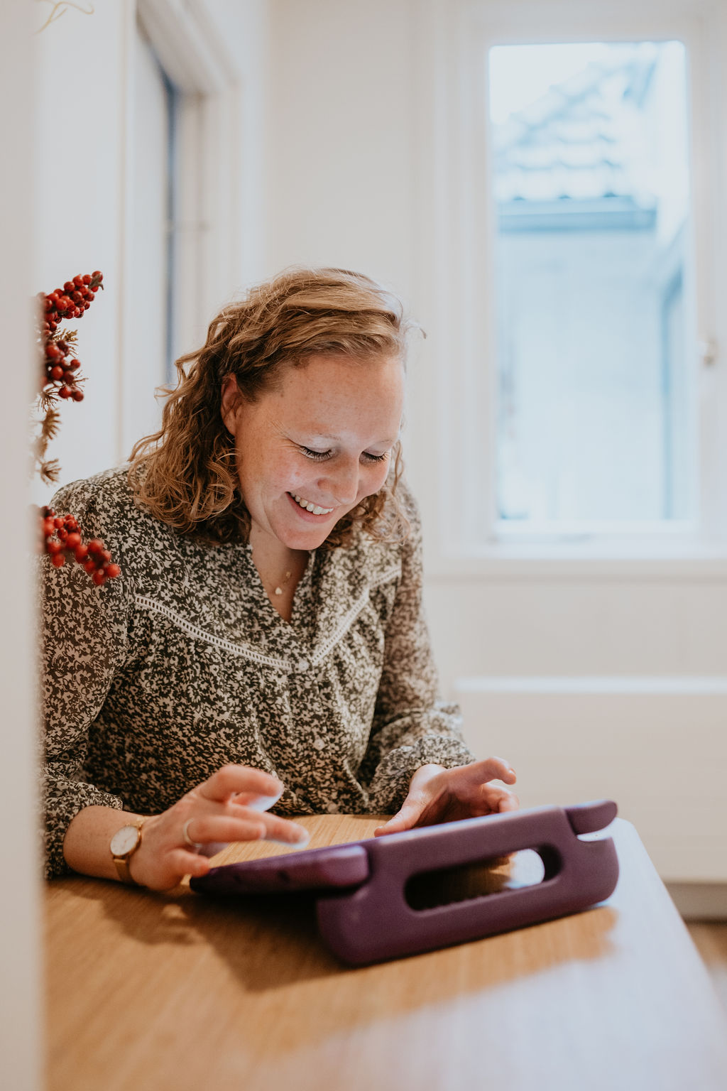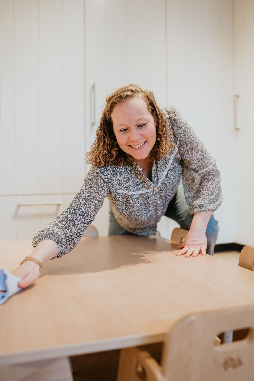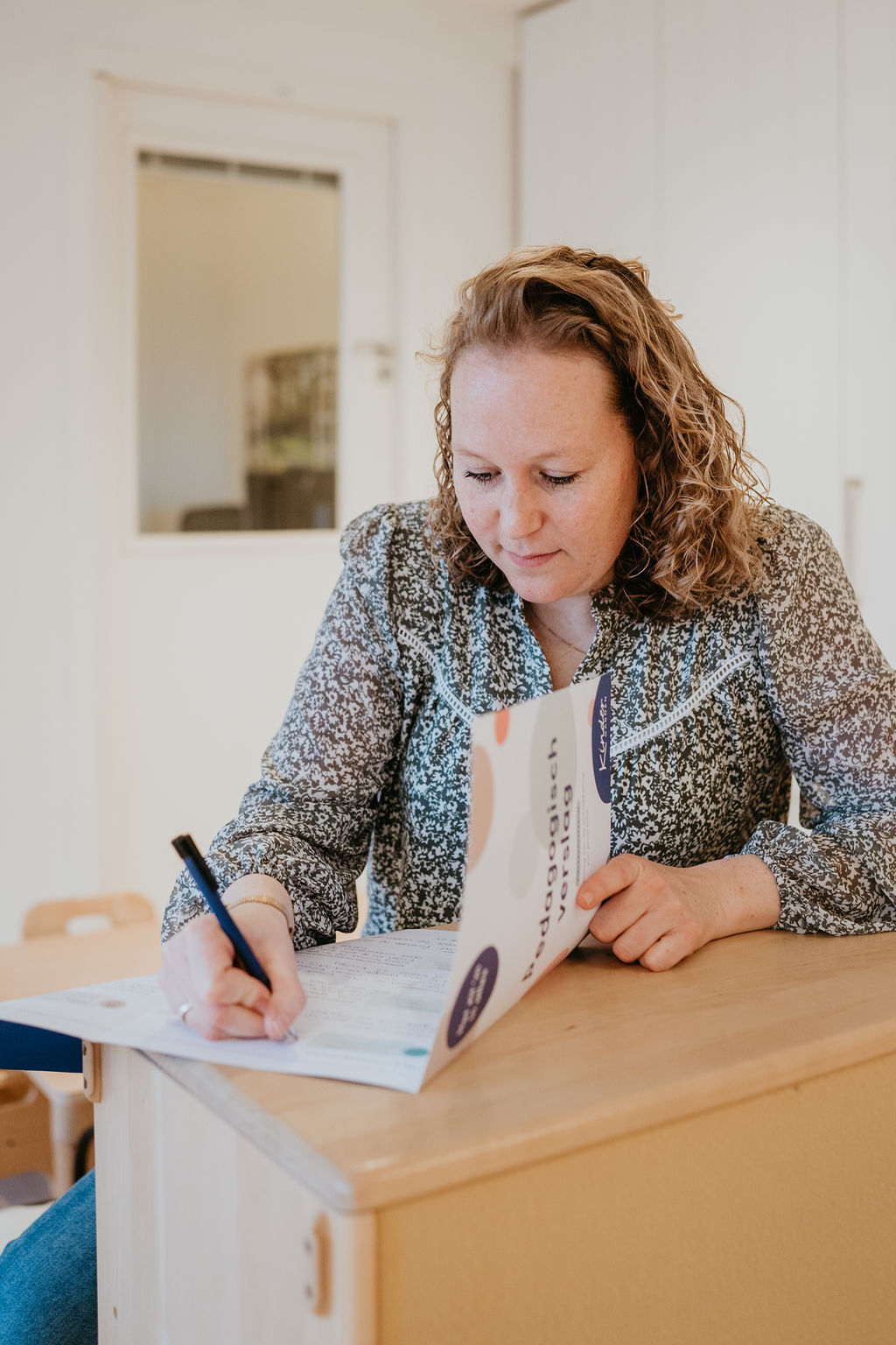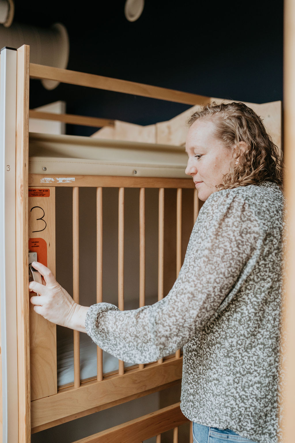 ‘De eerste kinderen komen meestal rond kwart voor acht, daarom beginnen we in een gemeenschappelijke ruimte met de baby’s, dreumesen en peuters. De baby’s gaan als eerste naar hun groep. Rust in de ochtend is namelijk fijn voor het verdere verloop van de dag. Voor mij betekent het op tijd naar boven met de peutergroep, om de kinderen in alle rust te ontvangen. Ze mogen spelen, tekenen, kleuren. We voeren gesprekjes en horen van de ouders hoe het de dag ervoor is gegaan: heeft hun kind goed geslapen en gegeten, is het fit? Samen met mijn collega hebben we maximaal vijftien kinderen op onze groep.’