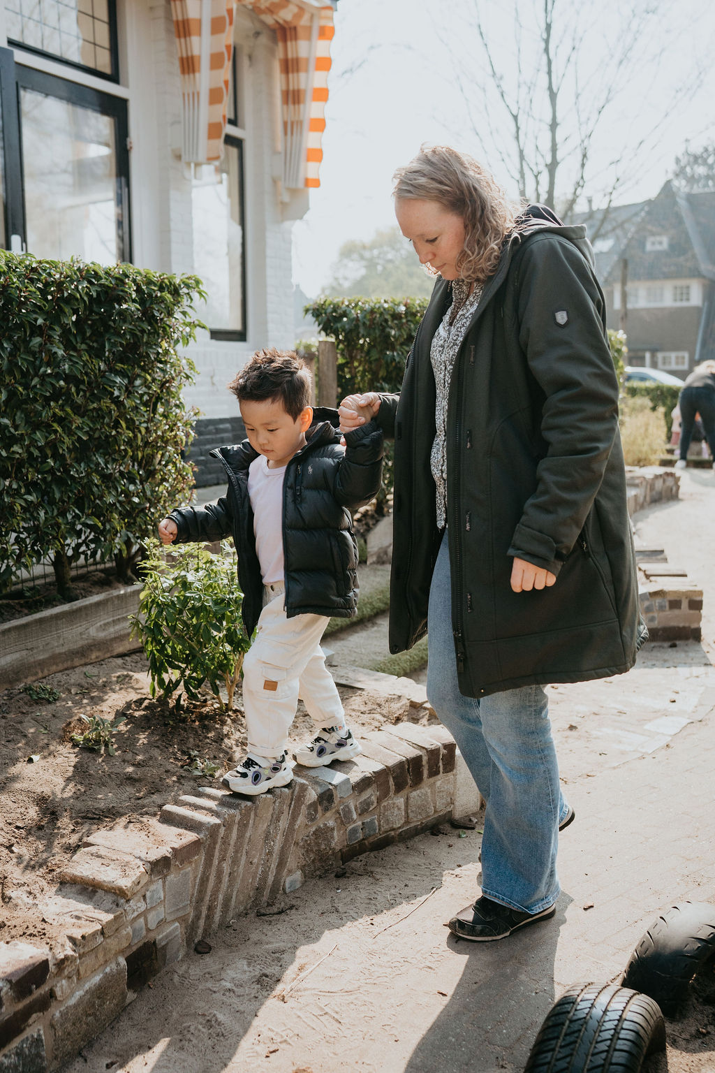 Zijn de fietsen bezet of gaat iemand ermee vandoor? Dan stimuleren we de kinderen om met elkaar te praten. Oplossen van problemen hoort erbij. Dreumesen geven vaak een fysieke reactie op wat ze ervaren, ze kunnen immers nog niet zo goed praten als de peuters. De kinderen kijken elkaar dan aan, zo van: nu moeten we het zelf doen. Dat is even schakelen, want meestal lossen ouders of volwassen iets op. Vaak verzint het ene kind een compromis en gaat de ander daarin mee, of komt het andere kind met een voorstel. Met jassen en schoenen aantrekken helpen kinderen vaak uit zichzelf andere kinderen die bijvoorbeeld net nieuw zijn in de groep. Wij geven dan een compliment: wat goed dat je hebt geholpen!’