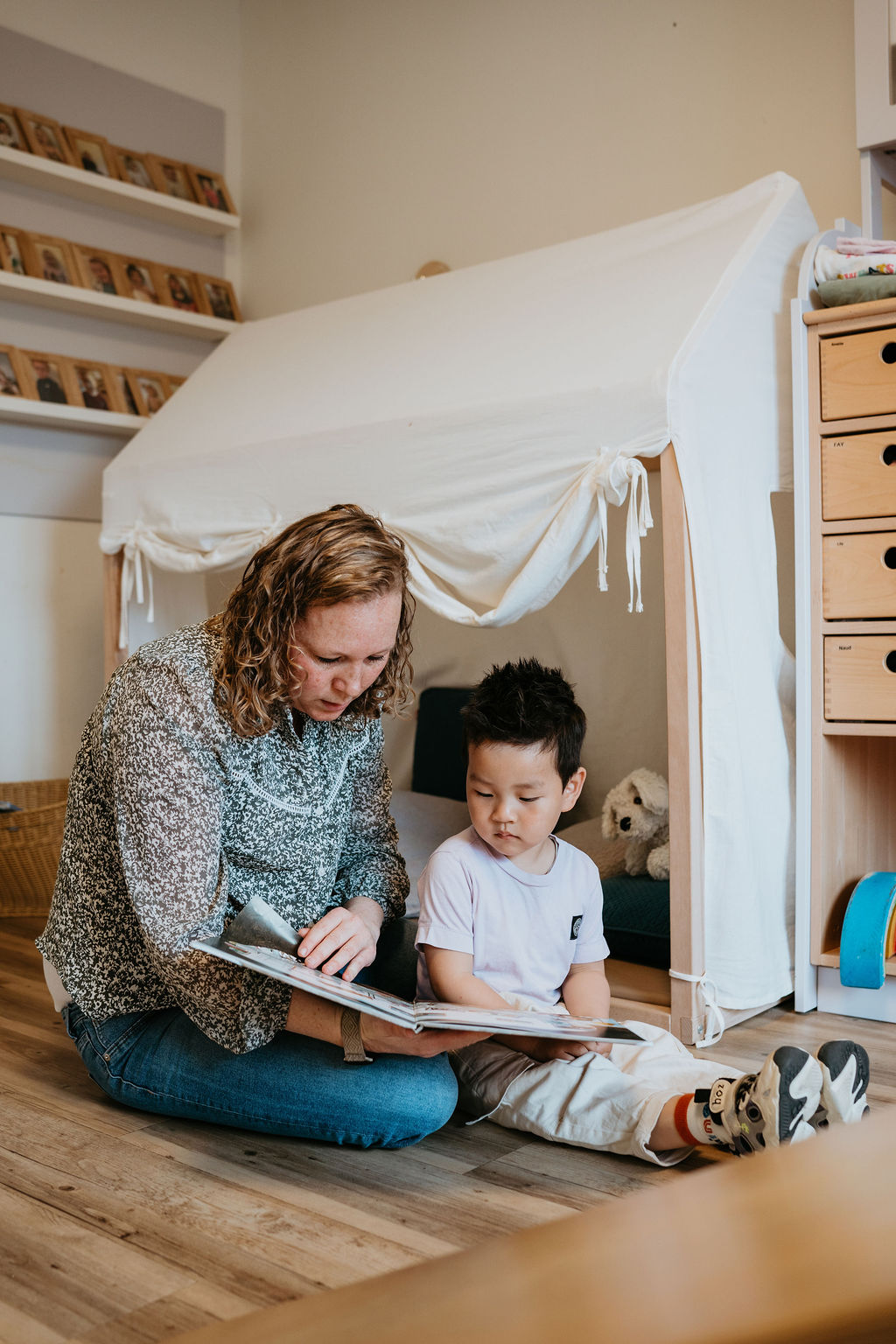 ‘Samen liedjes zingen aan tafel of tijdens eetmomenten, spraak stimuleren door een gesprekje te starten of door kinderen te laten inhaken op een verhaaltje; ze uitnodigen door een moeilijk woord te gebruiken. En ik vind het fijn om geborgenheid te geven op de groep. Als je een band met de kinderen hebt, als ze je vertrouwen, zo mooi. Je wil toch elke dag de veilige haven zijn waaruit ze de wereld gaan ontdekken.’