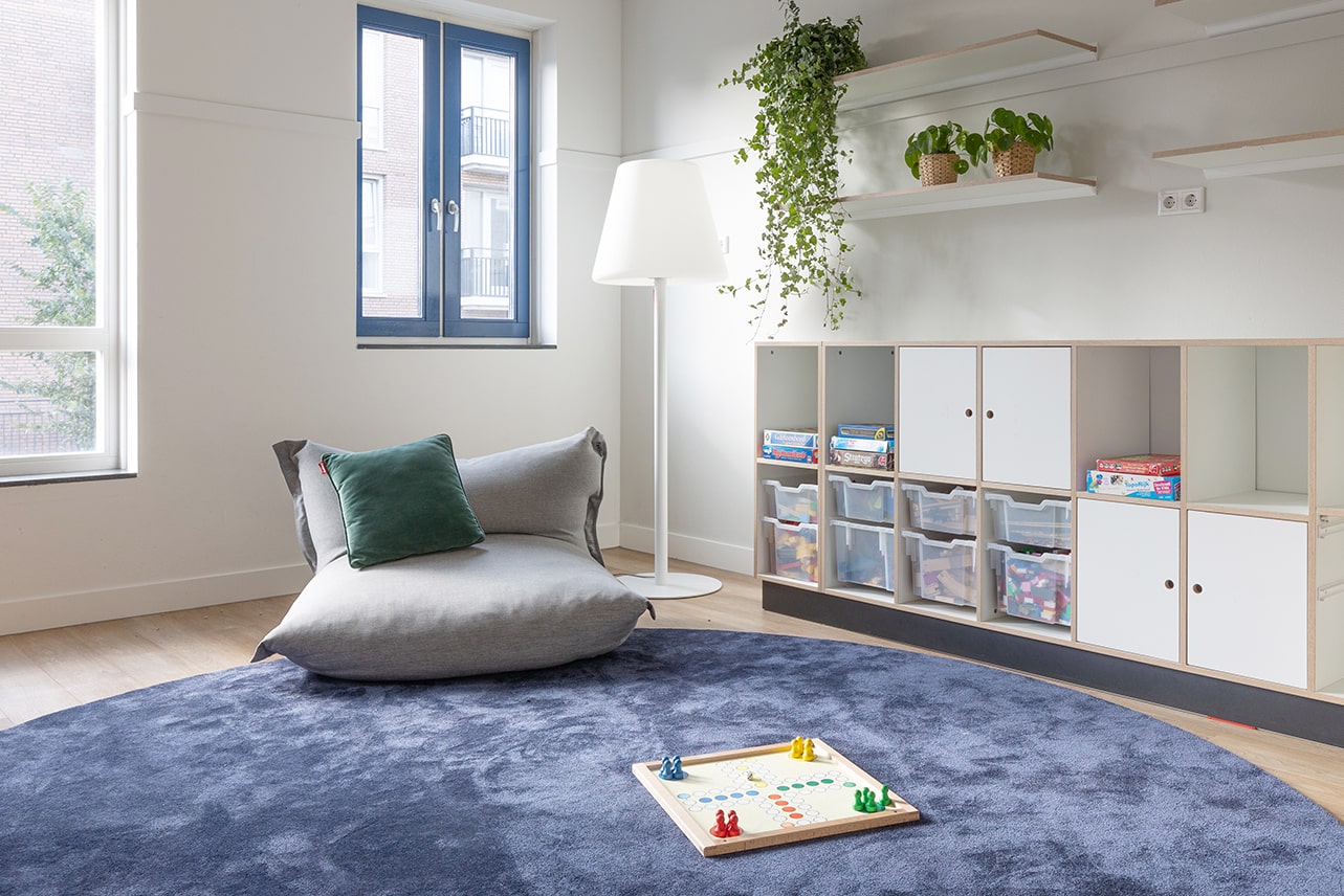 Onze vestiging heeft een warme en huiselijke sfeer. In de woonruimte kunnen kinderen fijn ontspannen na een drukke dag op school. Even heerlijke chillen op de bank of in de zitzakken met een goed leesboek.