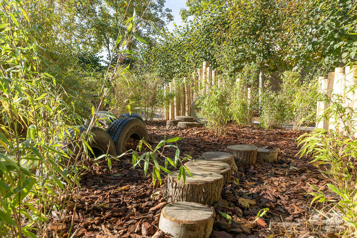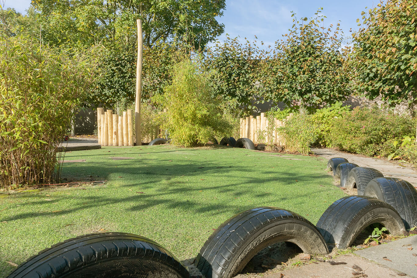 Onze grote, schaduwrijke tuin nodigt echt uit om te gaan ontdekken en spelen. Voor de baby’s is een afgeschermd stuk, waardoor de oudere kinderen zich naar hartenlust kunnen uitleven op het ontdekpad, het fietsparcours en hun evenwicht kunnen oefenen op de halve autobanden.