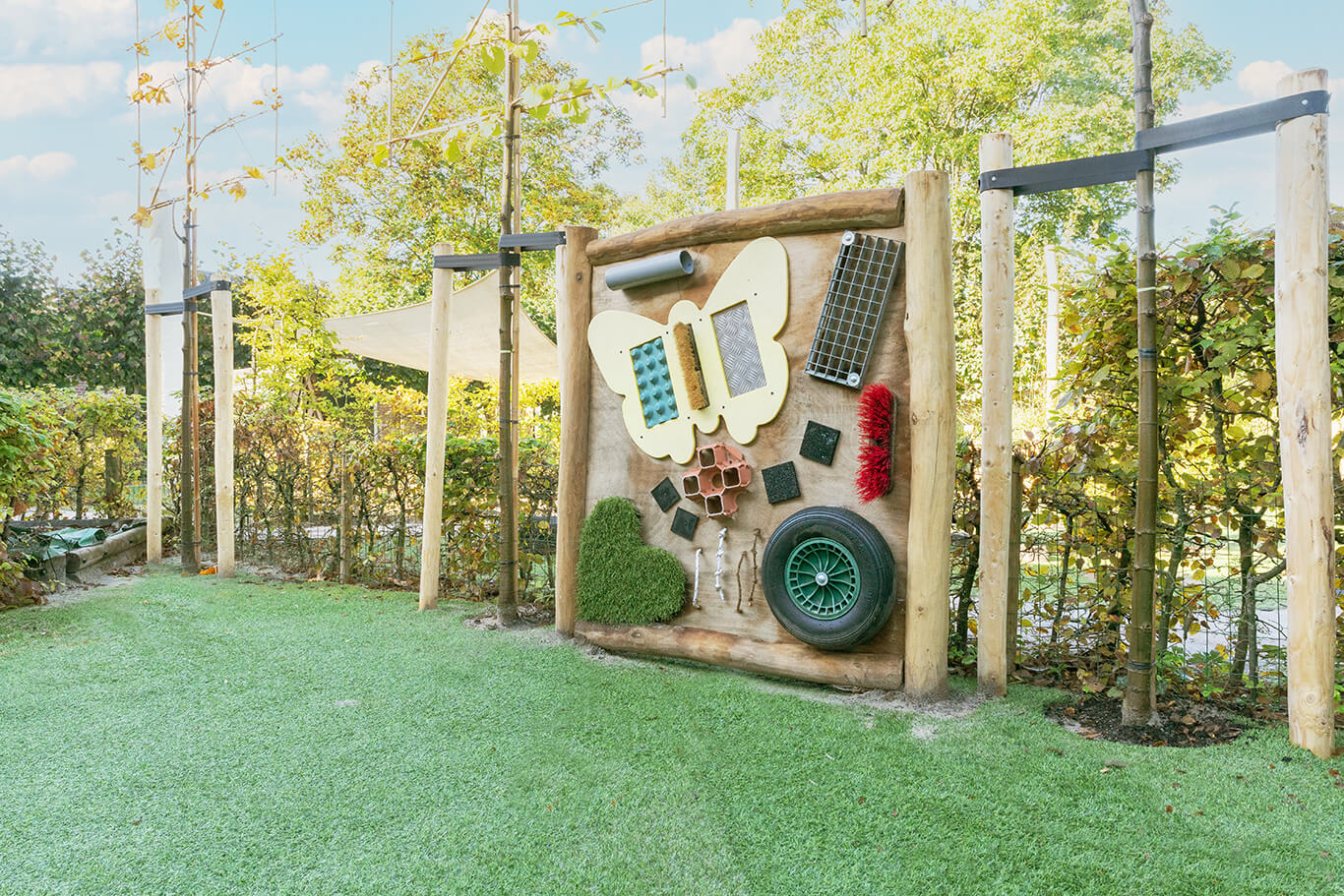 Buiten vind je een prachtige beschutte tuin met een apart deel voor de baby's, schaduwrijk door een zonnescherm en voorzien van een eigen zandbak. Achter in de tuin ontdek je een parcours met houtsnippers, bosjes en looppad. En in de moestuin zaaien, verzorgen, verpotten en oogsten de Pedagogisch Professionals samen met de kinderen.