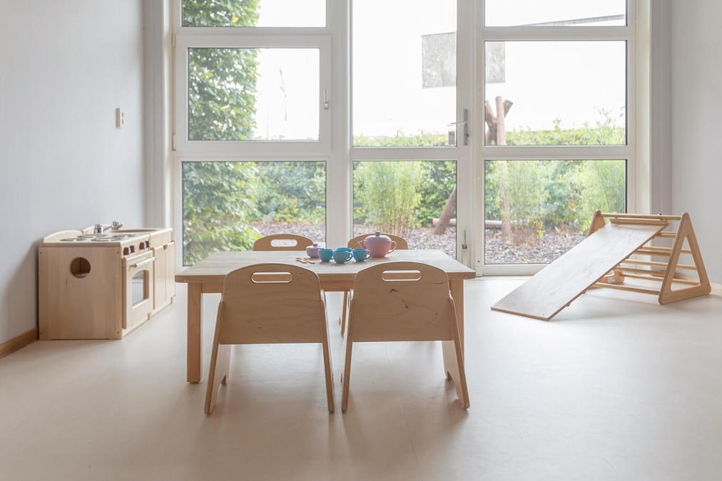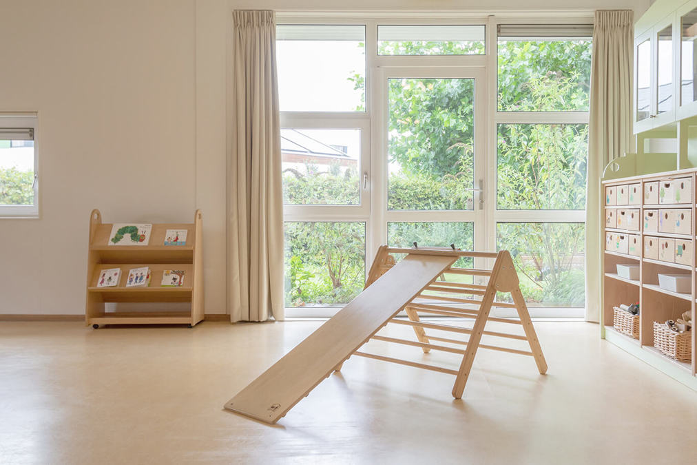 Elke groep heeft een deur naar buiten dat naar zijn eigen tuin leidt. Onze baby's kunnen zo veilig de buitenruimte ontdekken: er is een schaduwrijke overkapping en ze hebben zelfs een eigen zandbak. Onze ontdekkingstuin voor de dreumesen heeft een waterpomp, duikelrek en plekjes waar ze zich kunnen verstoppen. De moestuin verzorgen we met de kinderen: stekjes opkweken, oogsten en samen smullen van die paprika, komkommer, munt, aardbeien en peren!
