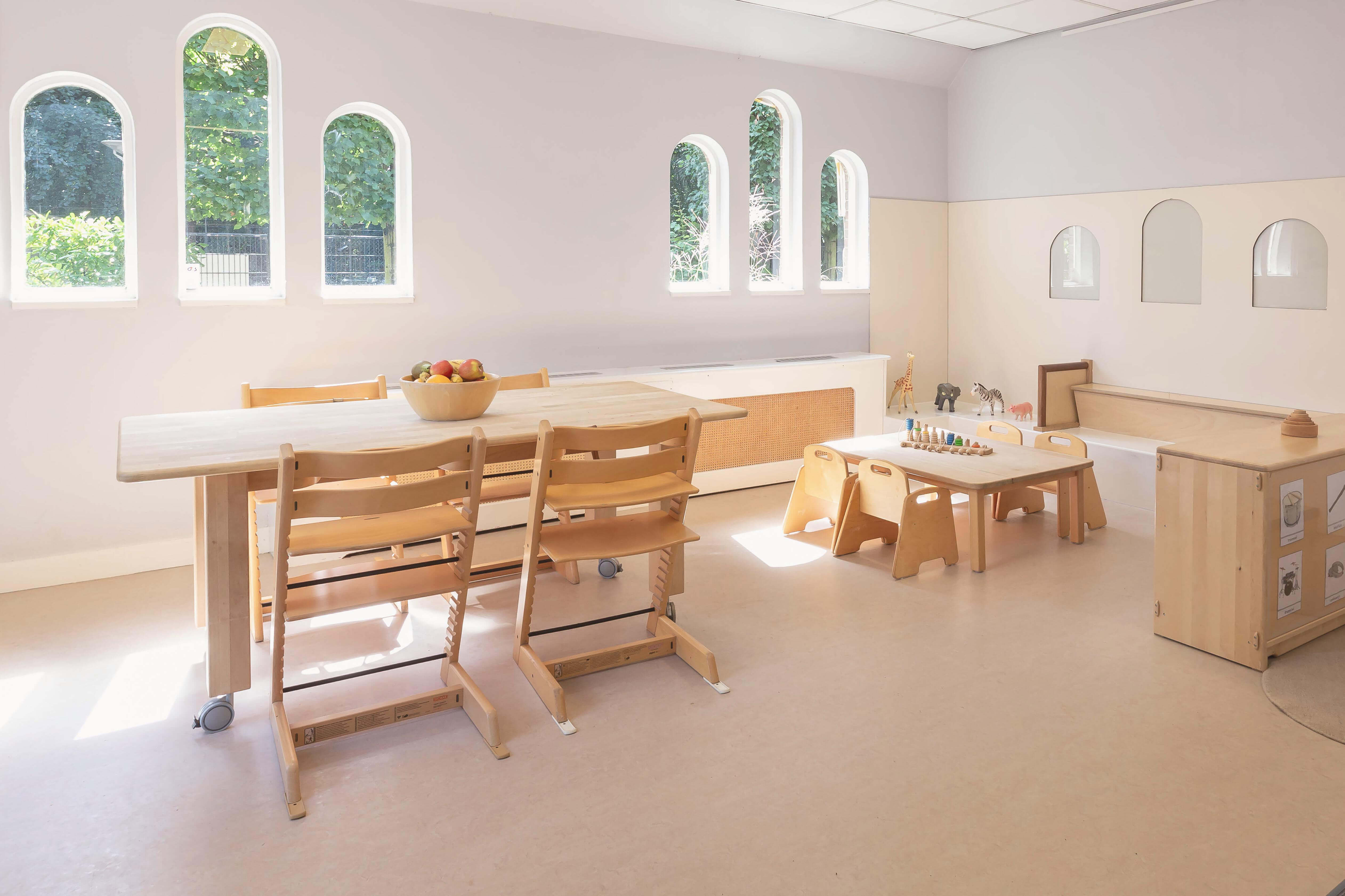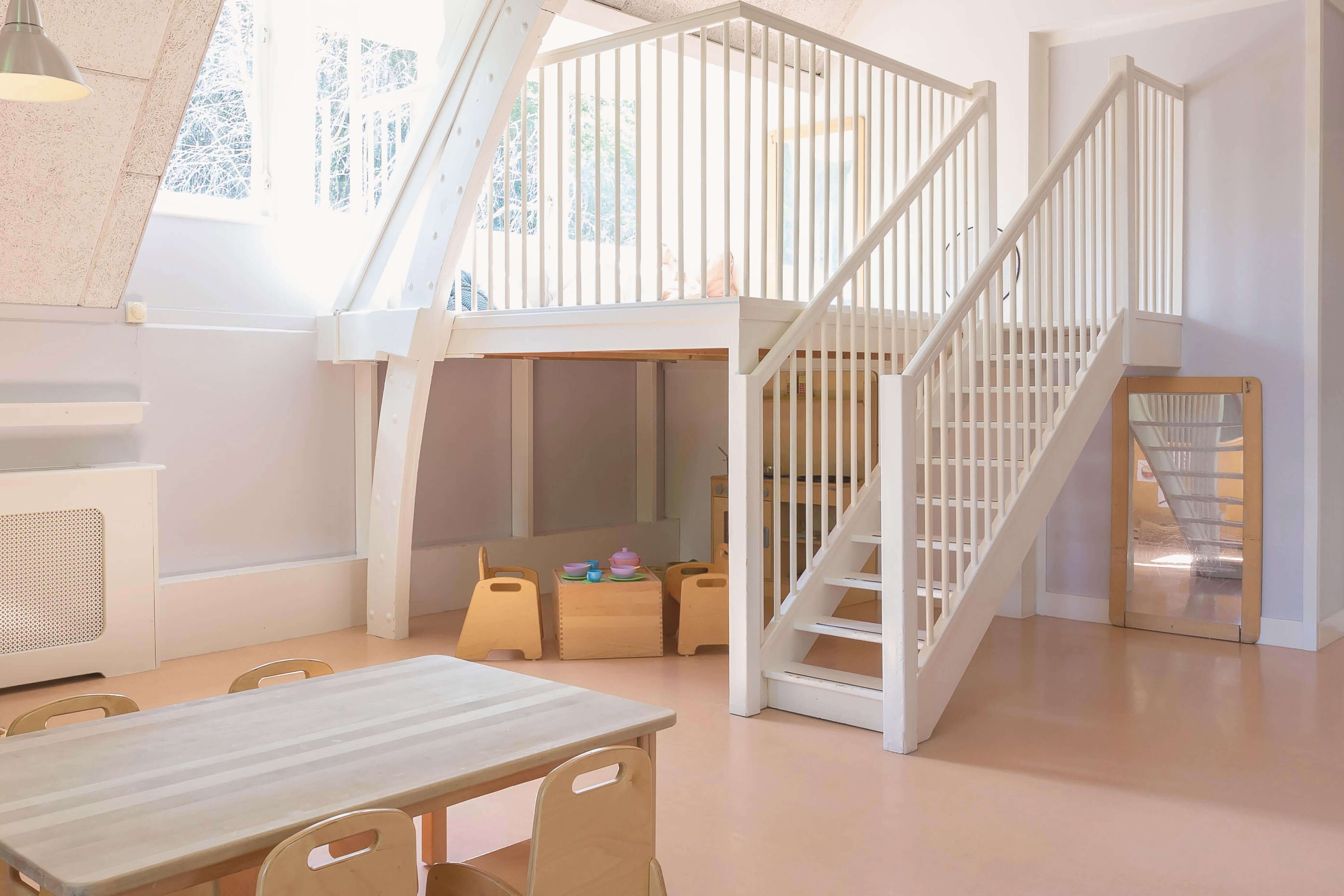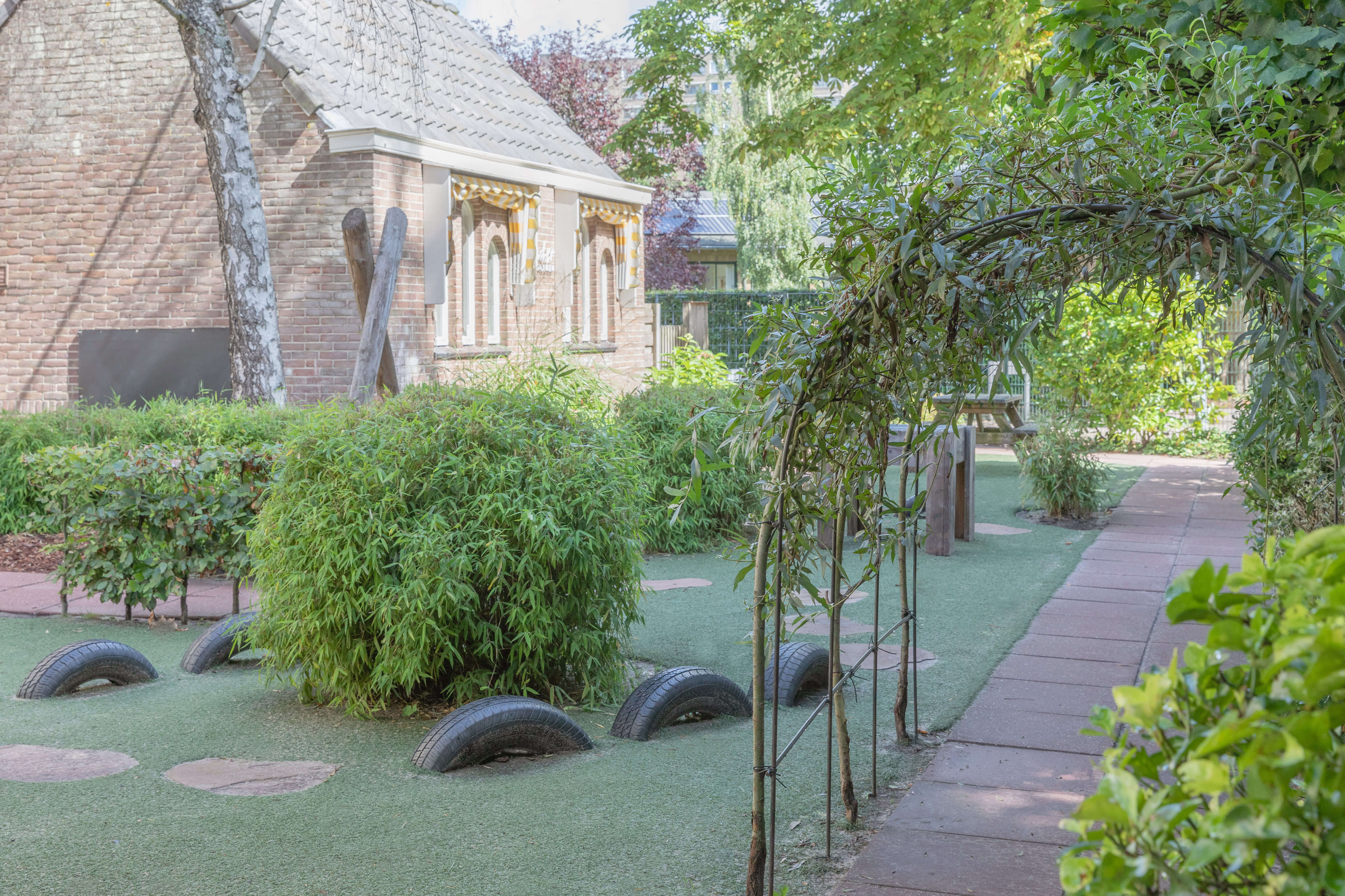 In een afgezet stukje babytuin kunnen de allerkleinsten in alle rust veilig van de buitenlucht genieten en vrij bewegen. De oudere kinderen verstoppen zich intussen in het kiekeboebos, fietsen over het parcours, of spelen in de zandbak of buitenkeuken. De groene tuin van dit voormalige klooster is groot genoeg om alle drie de groepen tegelijk buiten te laten spelen.
