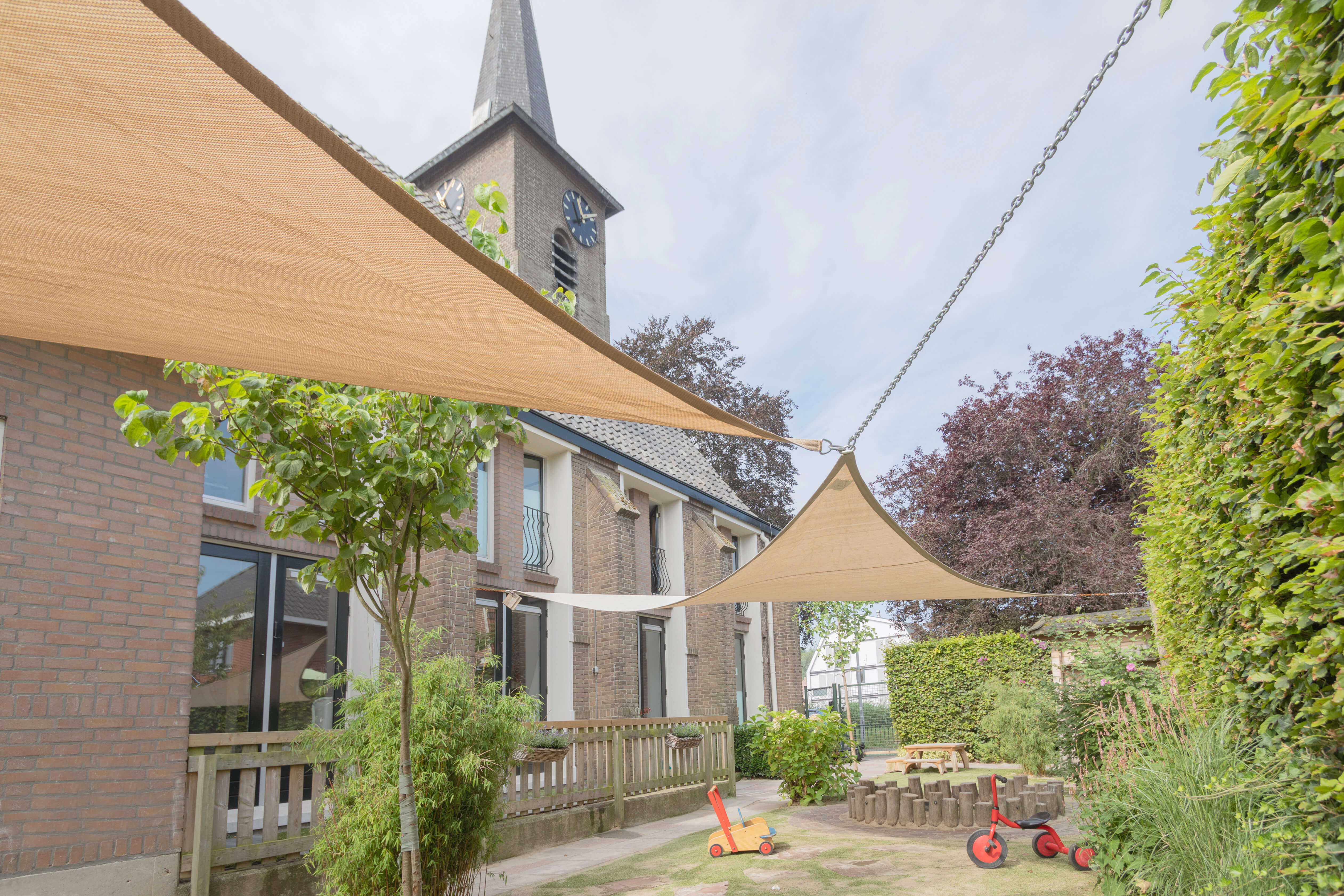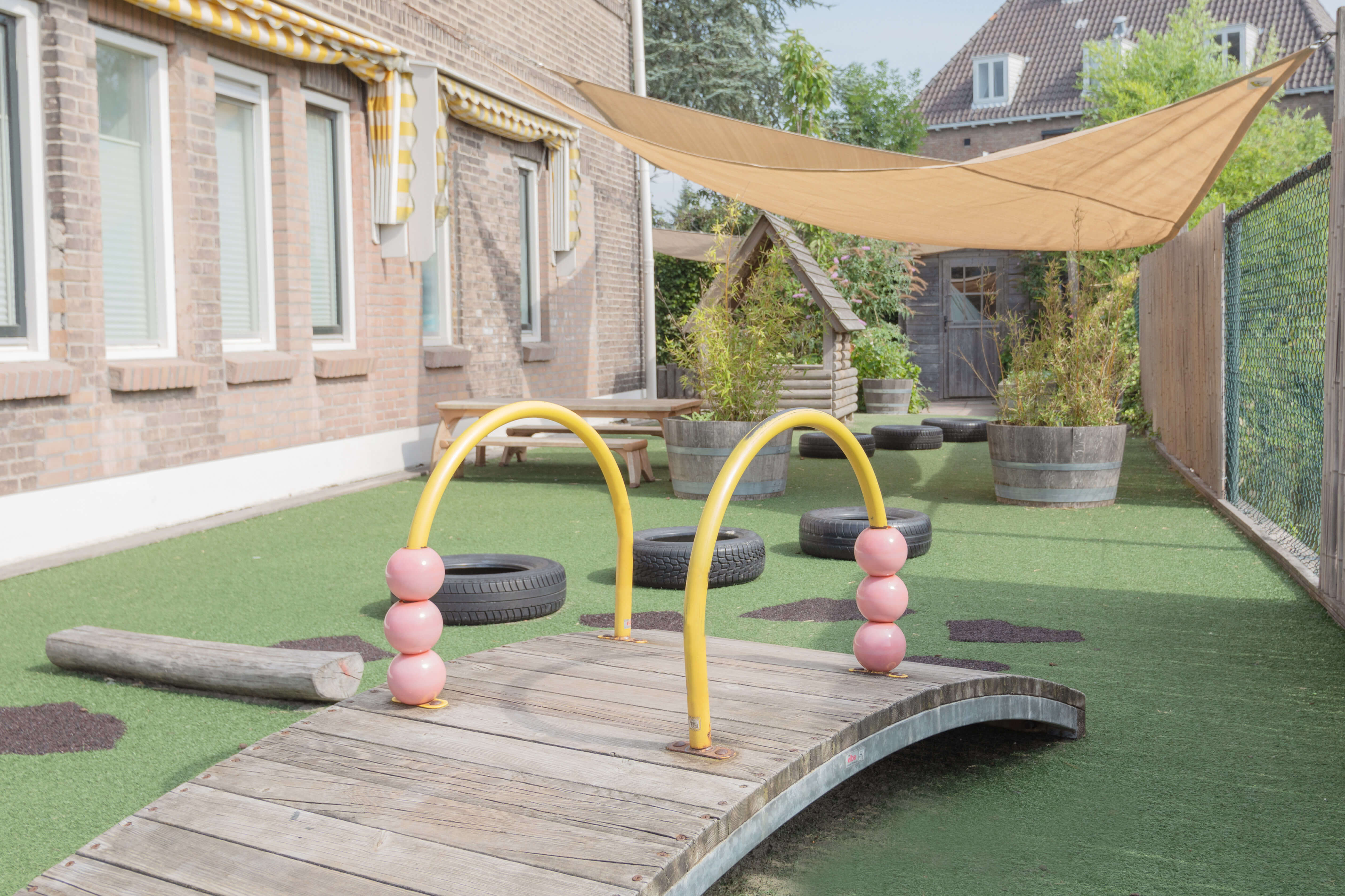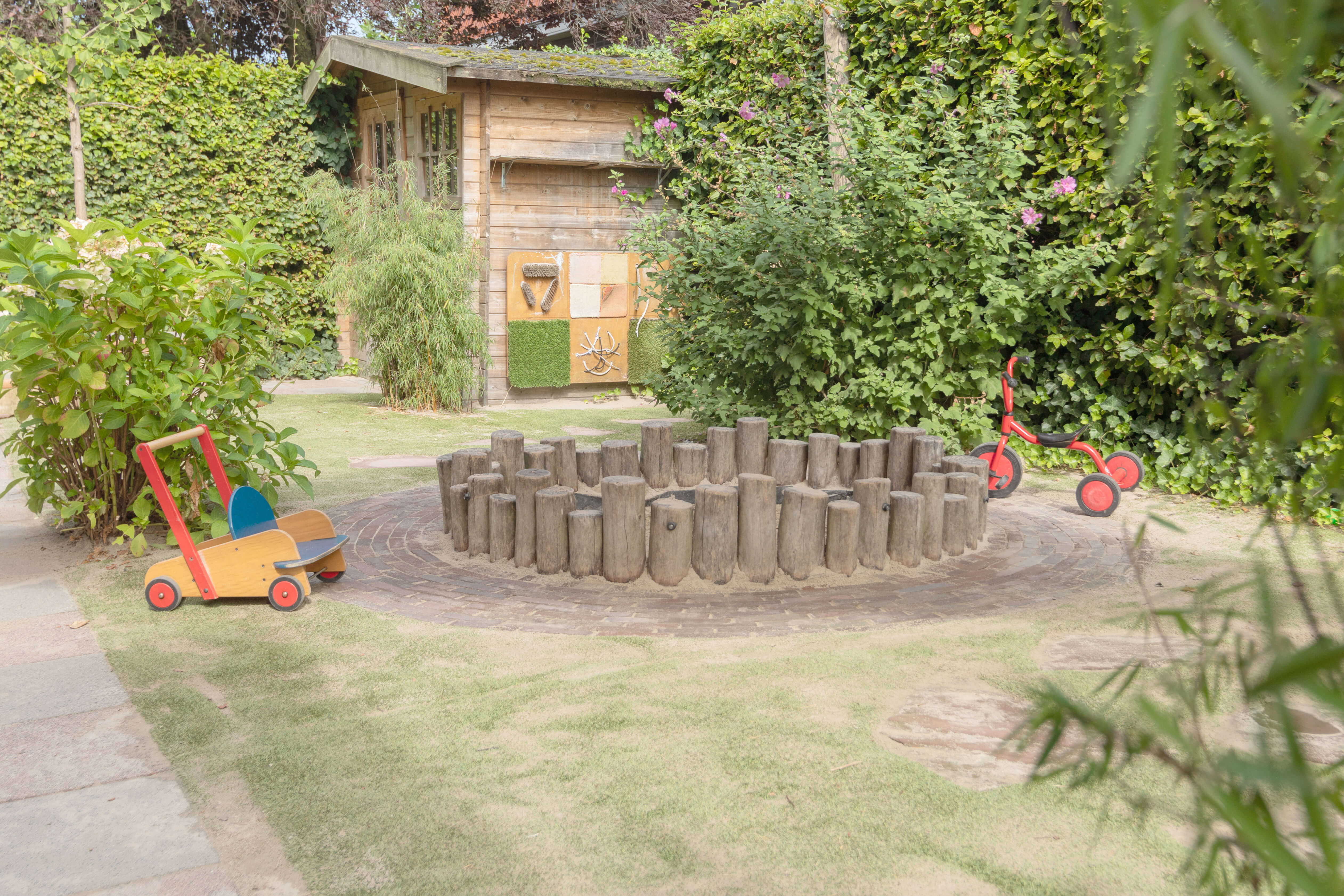 We hebben een dreumestuin, een peutertuin en voor de baby's een afgeschermd deel waar ze rustig van de buitenlucht kunnen genieten. De dreumesen oefenen hun balans op het heuveltje, fietsen, spelen samen in de zandbak of even alleen in een van de hoekjes. De peuters zijn actief met uitdagende elementen als het bamboebosje, speelhuisje of de moestuin.