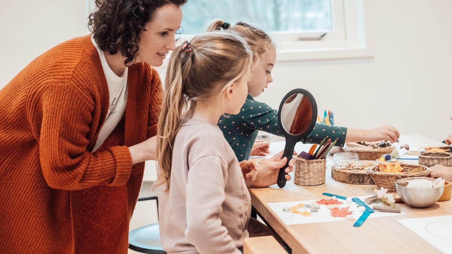 Hier kunnen de kinderen echt hun fantasie en creativiteit de vrije hand geven. We dagen ze uit door allerlei verschillende materialen aan te bieden (hout, steen, klei, verf en bijvoorbeeld ecoline). Dus zeker niet alleen knutselen en tekenen maar ook ontwerpen, vormgeven, bouwen en handarbeid.