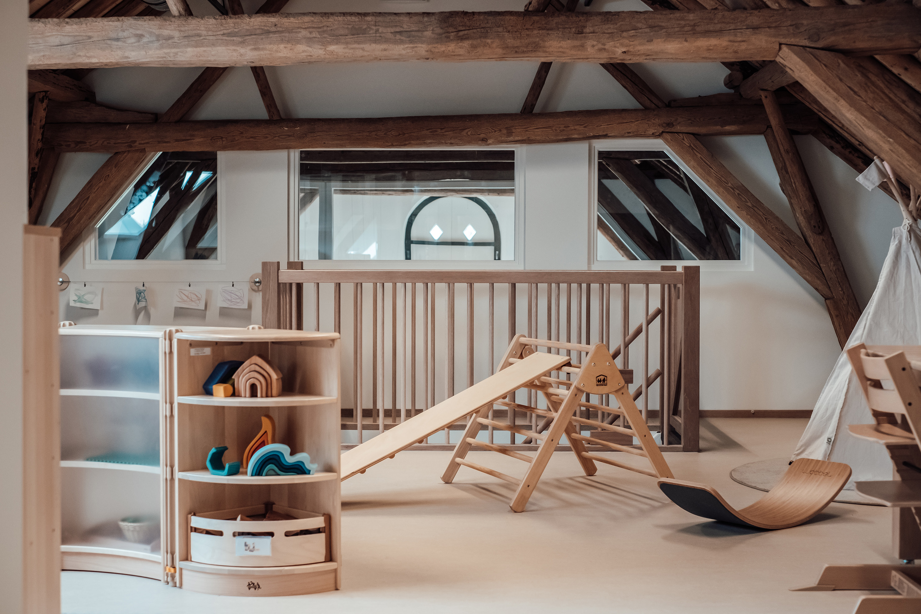 In onze babytuin genieten de baby’s veilig van de buitenlucht in hun eigen afgeschermd tuin. Terwijl de oudere kinderen zich ook kunnen uitleven met spelen in de zandbak of kunnen racen op de kleine fietsjes of skelters.