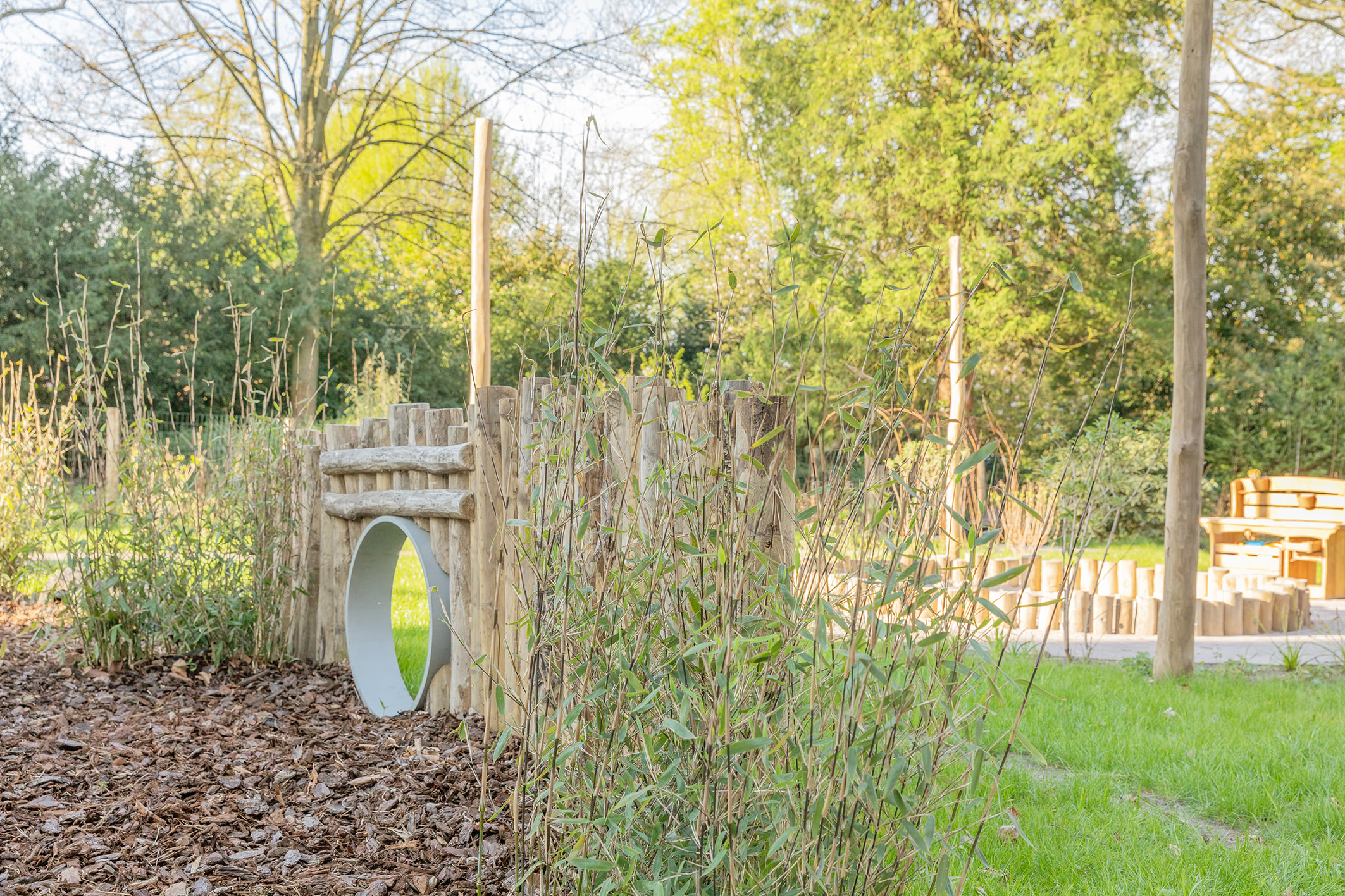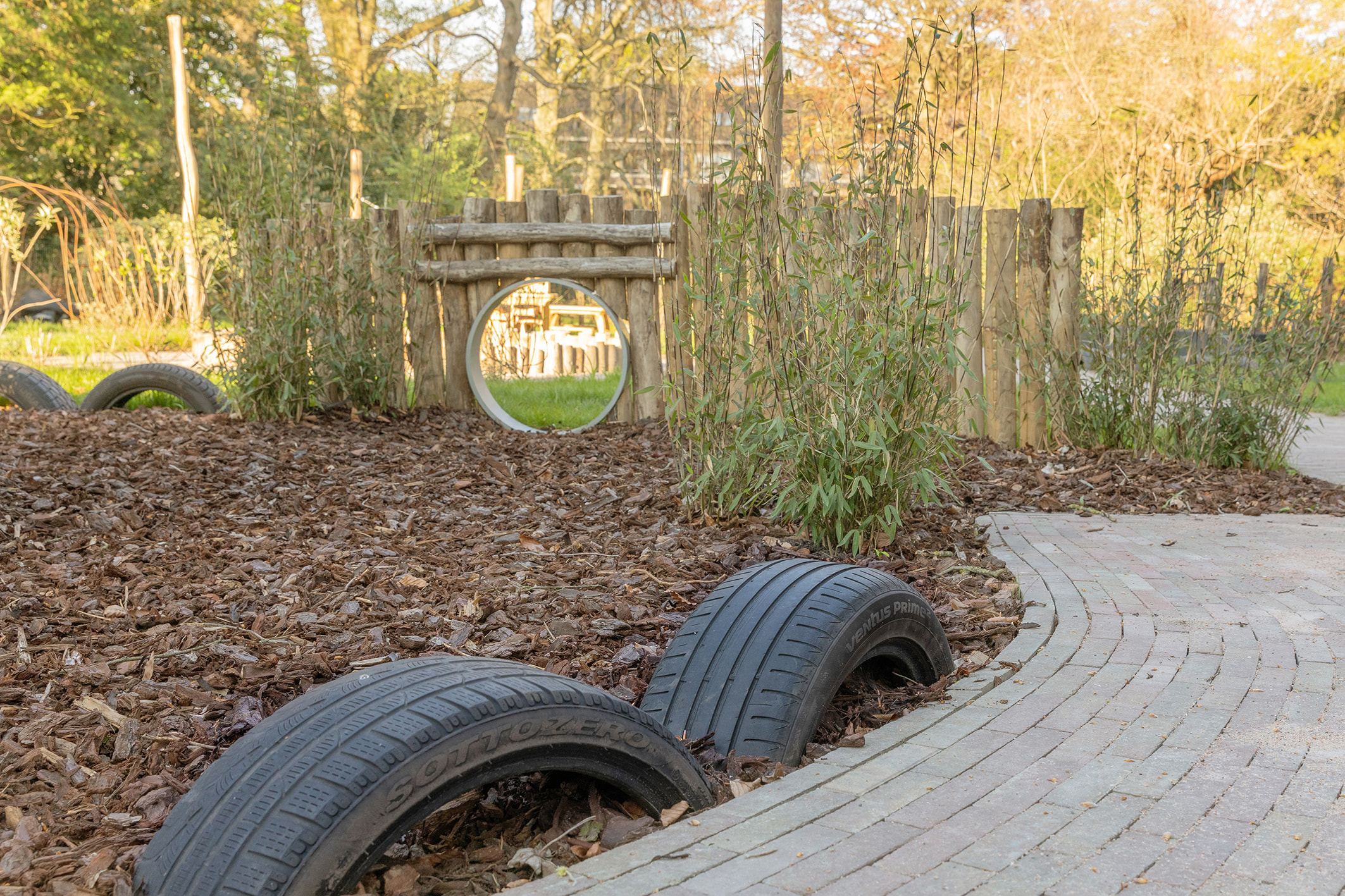 Onze grote, schaduwrijke tuin nodigt echt uit om te gaan ontdekken en spelen. Voor de baby’s is een afgeschermd stuk, waardoor de oudere kinderen zich naar hartenlust kunnen uitleven op het ontdekpad, het fietsparcours en hun evenwicht kunnen oefenen op de halve autobanden.